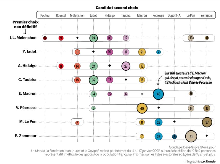 The fifth factor is strategic positioning. Le Monde’s polling analysis is summarized in a chart that measures voters’ second choice candidates. This analysis shows that Pécresse is the second choice among Macron voters and Macron is the second choice among Pécresse voters.
